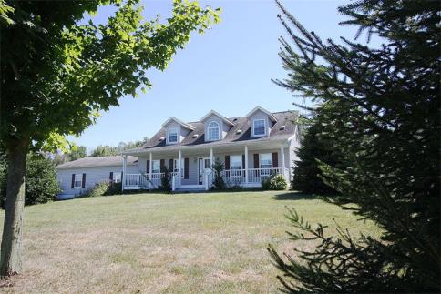 Spectacular hilltop setting with gorgeous views of the countryside, situated back off the road on 9.47 acres of land, Cape Cod design with a covered front porch and featuring 3 bedrooms and 2 ½ baths, a large living room with an open staircase, gorgeous cabinet filled kitchen with Corian counters and a nice breakfast bar, adjoining dining area, large1st floor master suite with private bath and jetted tub, convenient main level laundry room, semi finished lower level / bonus space, attached 2.5 car garage plus two huge garages / barns / workshop areas that measures 50 x 100 with 14 foot ceiling and concrete floor plus a 28 x 40 pole barn. You will be IMPRESSED! $275,000.