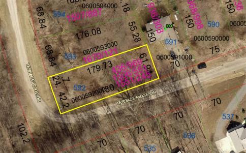 Corner lot located in Grand Valley View Subdivision, situated on the corner of Terrace Ridge Drive and Terrace Ridge Circle, lot measures .2587 of an acre, located in Brown Township and in Mount Vernon Schools, priced to sell fast at $3,500.